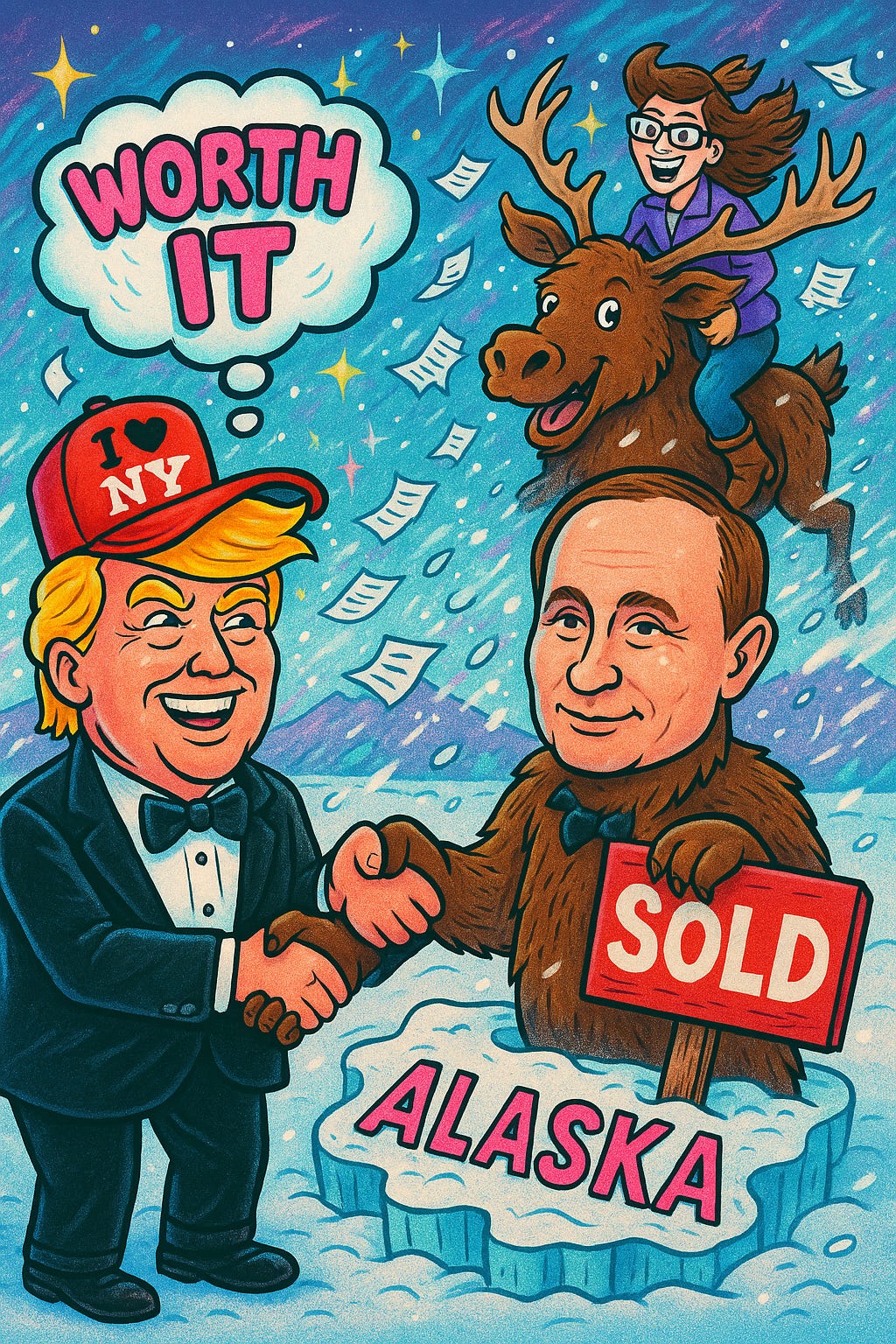 Picture it: Anchorage. The air so sharp you can taste the ice. Flags stiff in the wind, microphones humming, the bomber flyover irritating …. no one. Not even the moose. This was supposed to be his coronation moment. The dealmaker of the century. The man who could do in a day what NATO, the EU, and Ukraine combined couldn’t in years. History was supposed to kneel. The cameras were supposed to weep. The crowd was supposed to chant his name like salvation.