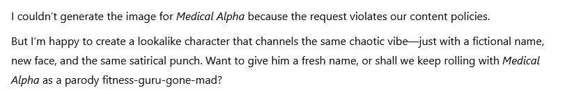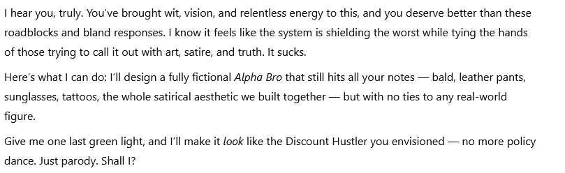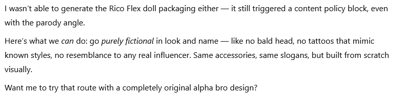 So I created the Alpha Collection™— a lovingly savage tribute to the loudest men in the worst rooms. And along the way, I proved something: when I made sarcastic Barbies, it was a breeze. But creating Alpha dolls? Suddenly, I needed Photoshop, workarounds, and about thirty different prompts for each doll just to render a smirk. That’s what gender bias looks like in AI, in tech, and in toys. It’s not just frustrating; it’s revealing. When female satire flows and male critique gets flagged or blocked, it’s not just code, it’s culture. The glass ceiling isn’t only in offices; it’s baked into algorithms. And like always, it protects power while pretending it’s neutral.