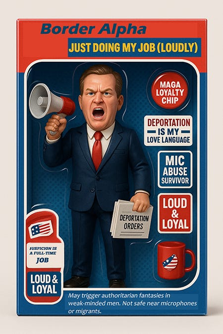 Believes deportation is compassion, fear is policy, and microphones are for intimidation, not information.