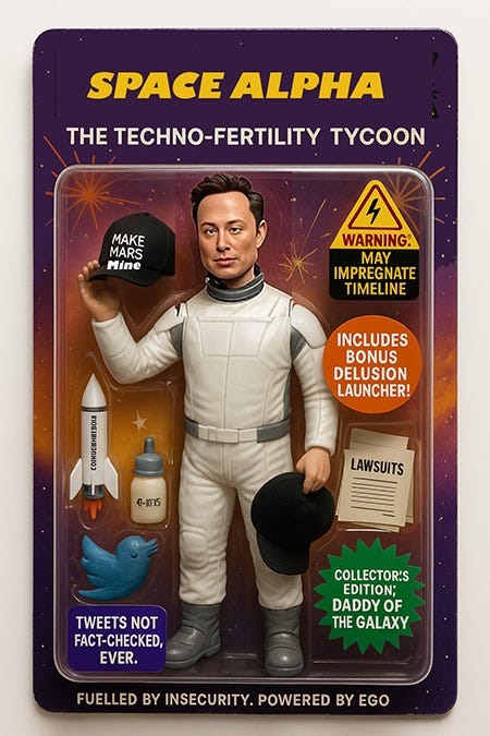 Self-declared genius. Algorithmic messiah. Natalist cult leader with 14 confirmed kids—and probably a few hundred in beta testing. Wants 5000 children, but only if they’re white, male, and engineered for perfect Daddy exposure on his own platform.