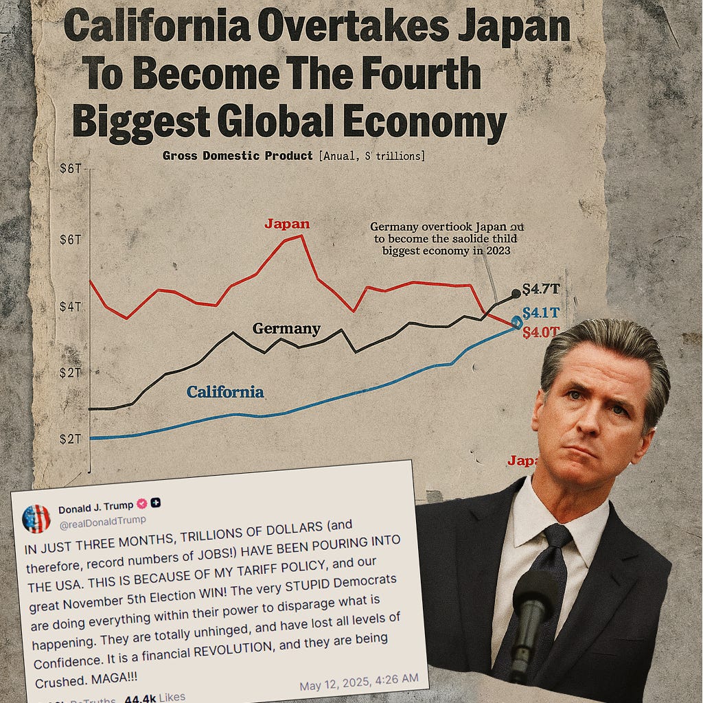 Welcome to the simplest collage you'll ever see. Tweets vs. Truth. Rhetoric vs. Reality. This art piece contrasts the political claim that Democrats ruin the economy with economic data: California's world-class GDP.
