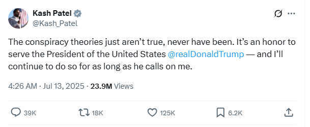 Backlash deepened when Patel posted on X days later, declaring: “The conspiracy theories just aren’t true, never have been.” He dismissed critics as unserious and reaffirmed his loyalty to Trump: “It’s an honour to serve the President of the United States—and I’ll continue to do so for as long as he calls on me.”